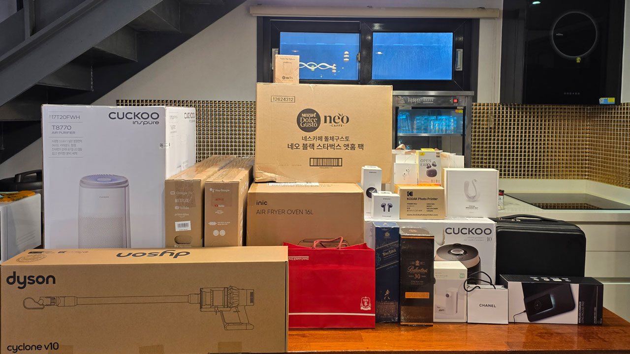 골드바, 다이슨 청소기, 쿠쿠 공기청정기, 쿠쿠 밥솥, 에어팟4, 갤럭시워치8 등