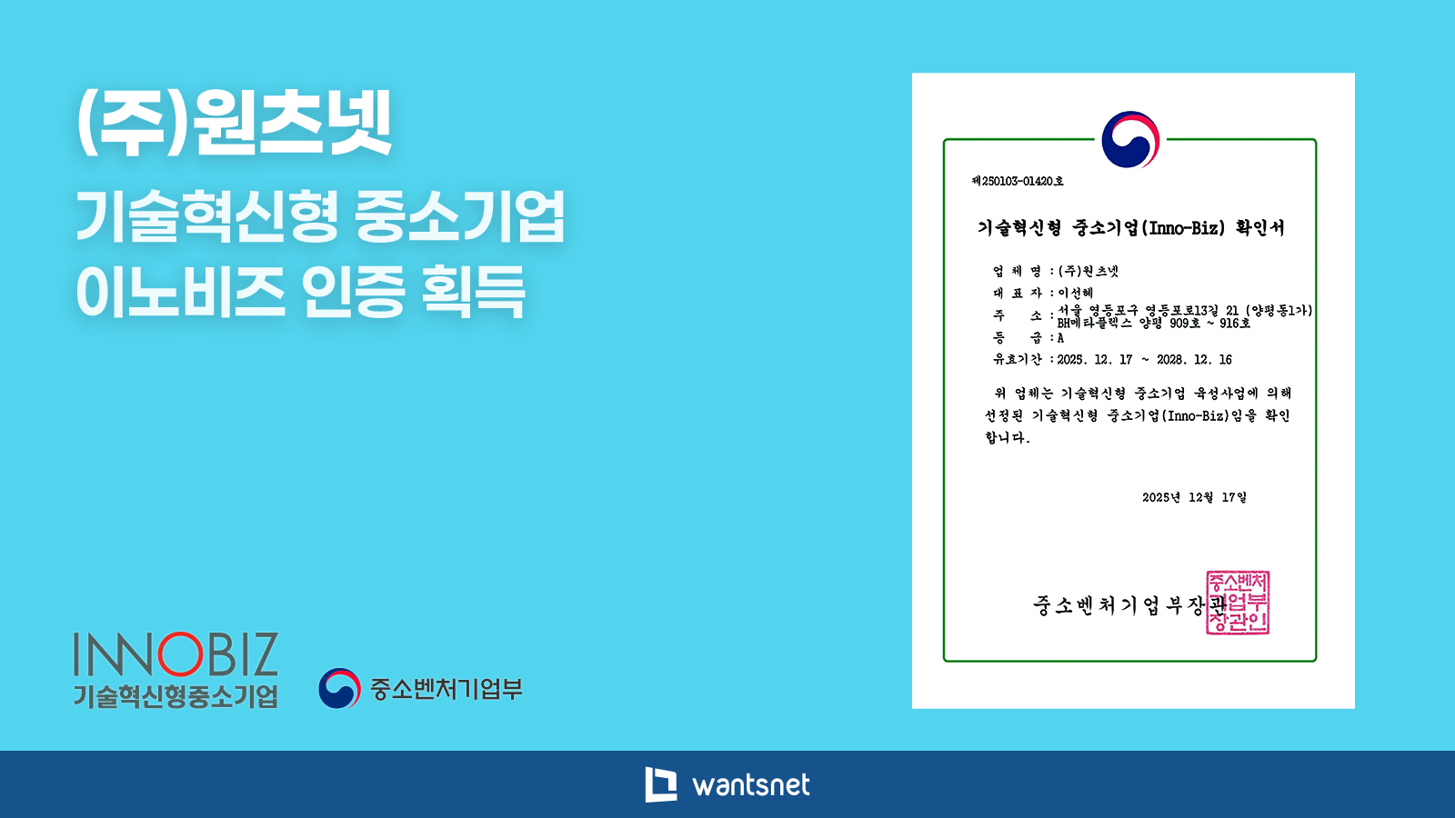 AI 인프라 전문기업 원츠넷(대표 이선혜)이 기술혁신형 중소기업 인증인 ‘이노비즈(INNOBIZ)’를 획득하며, 경영 안정성과 기술 혁신 역량을 동시에 갖춘 기업으로서의 경쟁력을 다시 한번 입증했다.